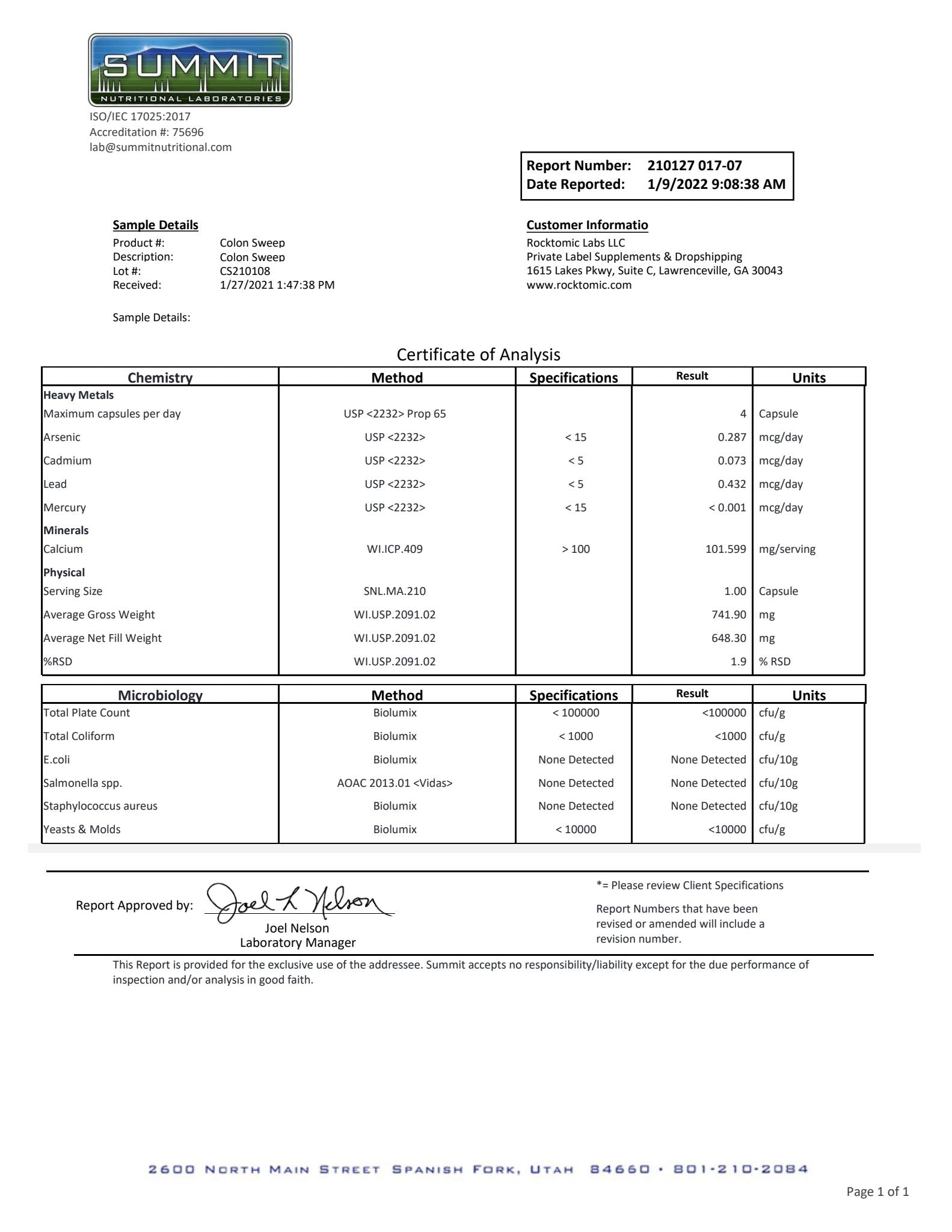 Colon Sweep is formulated to support detoxification, remove toxins, support digestive health, support healthy bowel movements, support healthy gut bacteria, and boost immune health. Our product is synthesized utilizing the latest scientific research and formulated with high quality ingredients. Our formula is third party independently tested for heavy metals, impurities, made in the USA, GMP certified, and produced in an FDA registered facility. 1% of the supplements on the market can match our world class standards. |